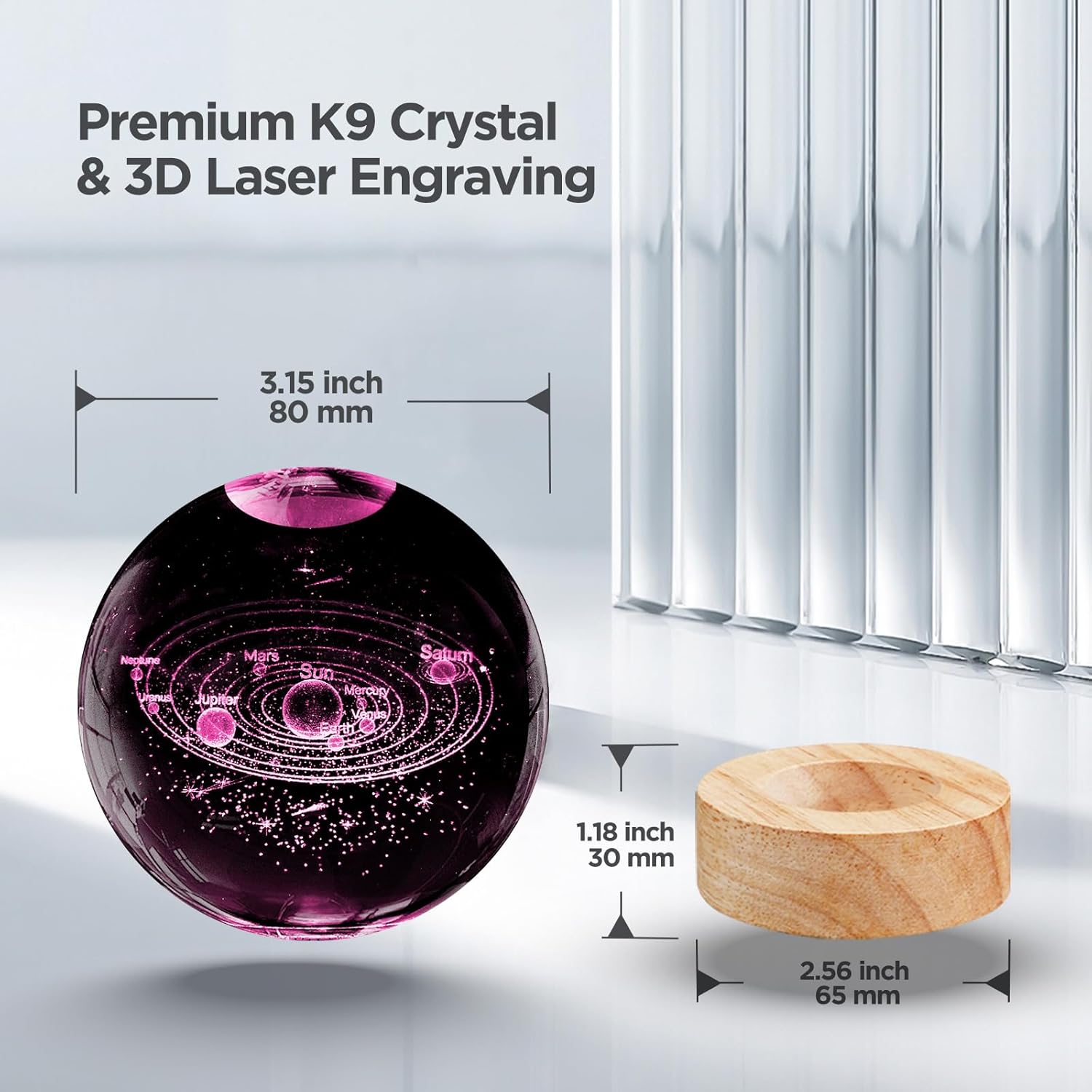 Crafted with advanced 3D laser engraving technology, this K9 crystal ball displays a beautifully detailed solar system that glows vividly when illuminated.