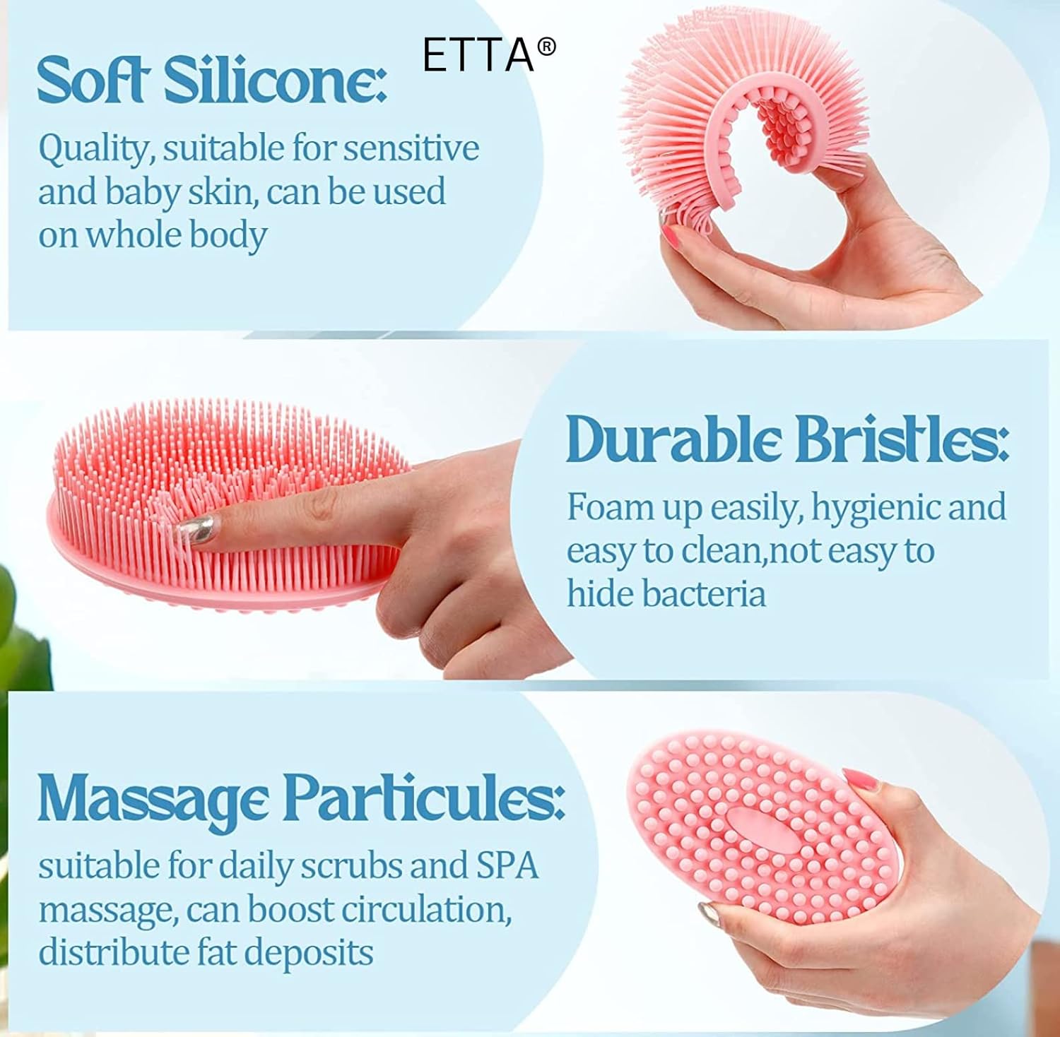 • Double-sided design: soft scrub bristles + massage nubs.