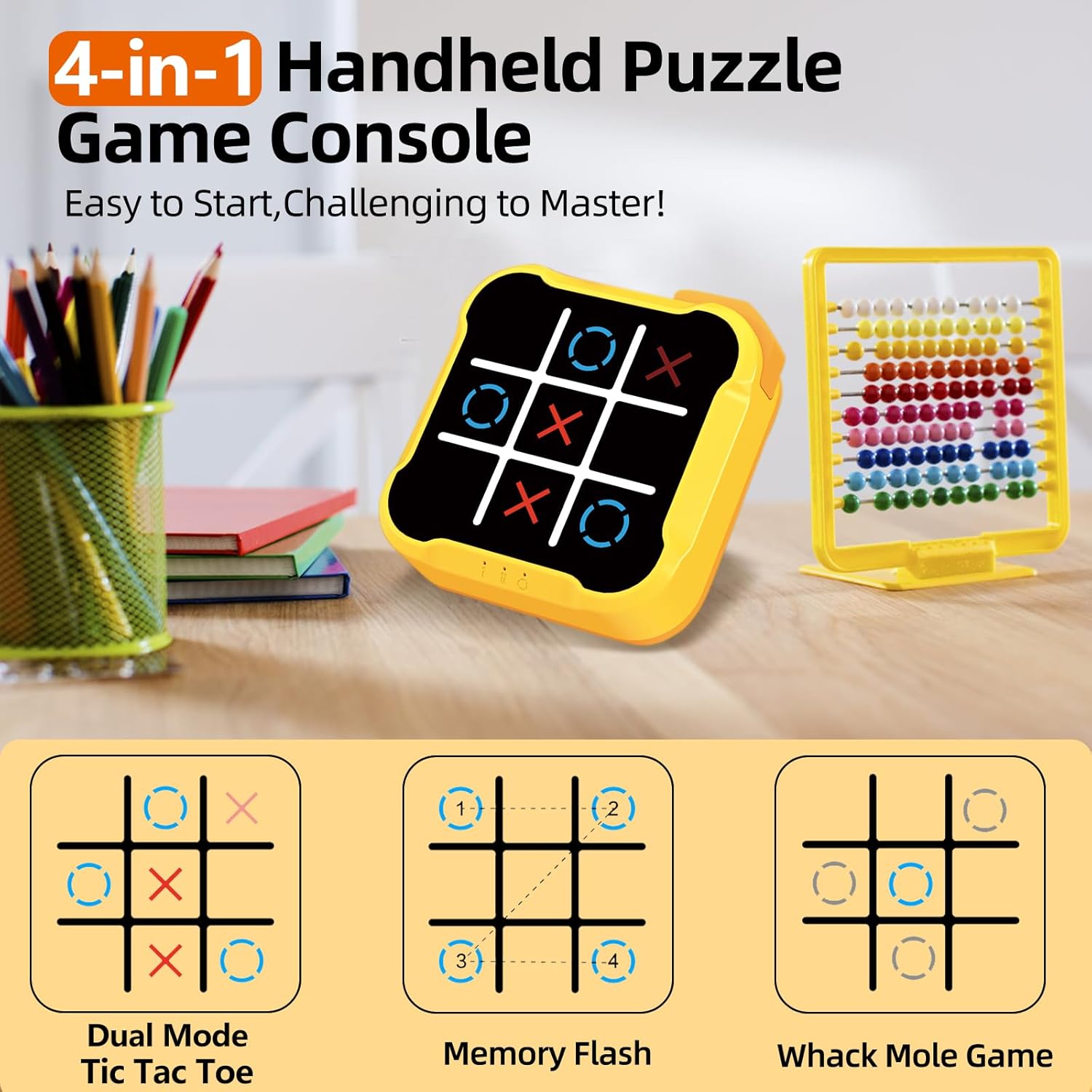 Bring home a new level of excitement and learning with this 4-in-1 Tic Tac Toe Sensory Puzzle Game Console, designed to entertain and educate children aged 6 to 12. Combining strategy, memory, and reflex training, this all-in-one handheld toy is perfect for both solo and multiplayer fun — at home, school, or while traveling!