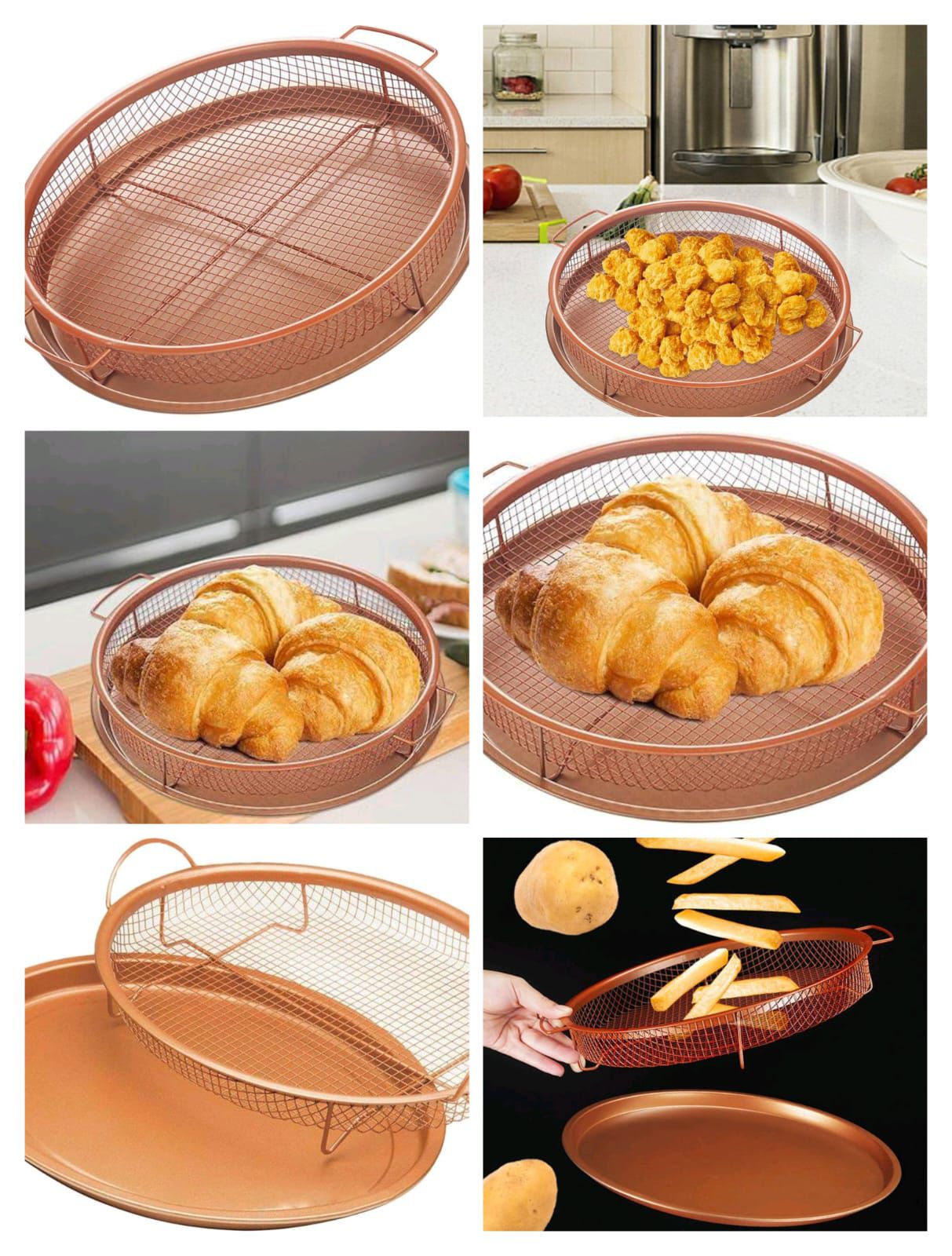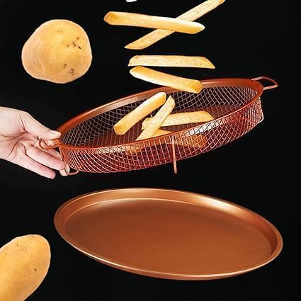 Enjoy perfectly crispy, golden-brown meals without the excess oil and mess! The Kitchen Crispy Tray & Drain Basin Set combines a durable mesh frying basket, a non-stick copper baking sheet, and a convenient oil drain pan. Perfect for baking, roasting, grilling, and frying, this versatile cooking set delivers healthier meals with restaurant-quality taste right at home.