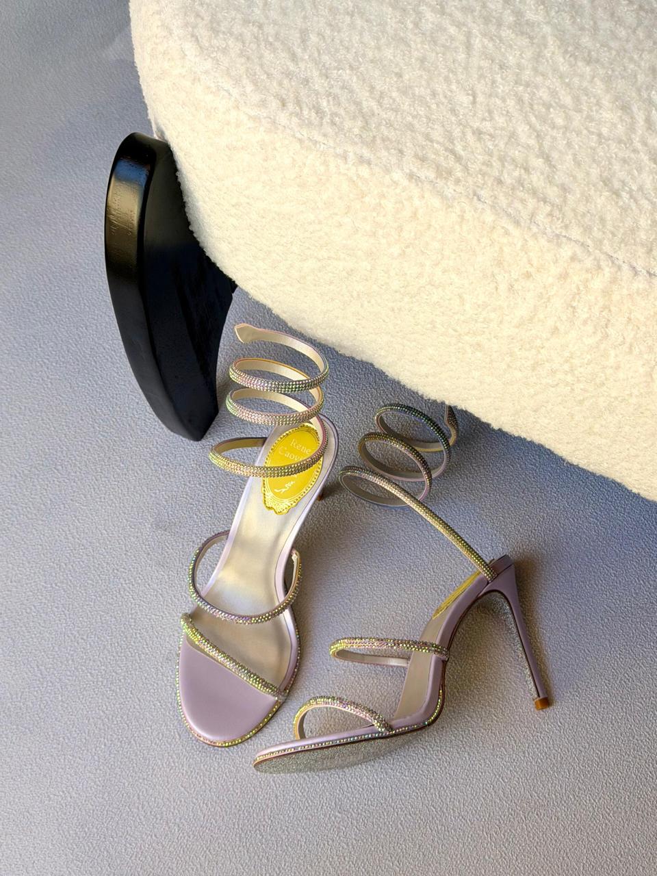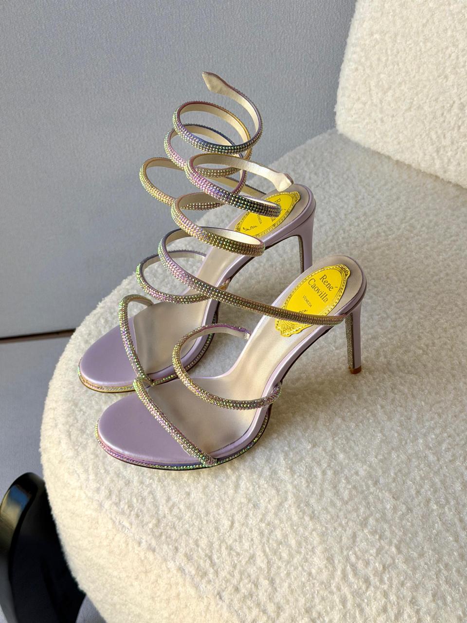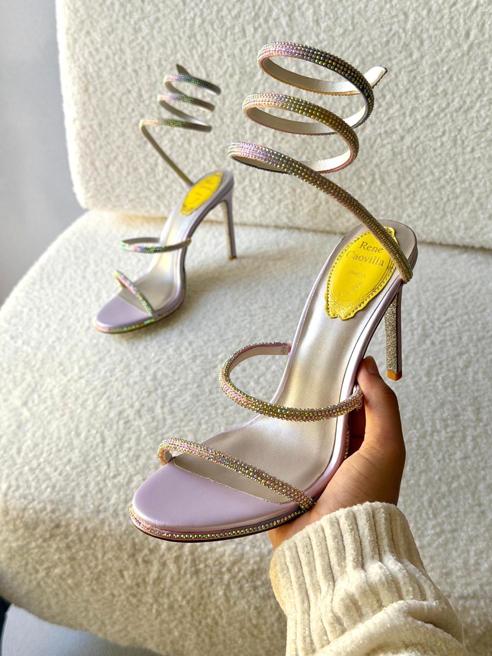 Elevate your evening look with René Caovilla Crystal Wrap Sandals, crafted with signature spiral crystal straps,  and elegant stiletto heel—perfect for weddings, red carpet events, and luxury celebrations.